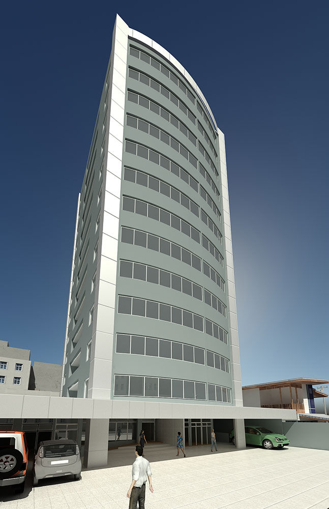 Projeto arquitetônico de edifício comercial de escritórios com fachada de vidro e alumínio composto. Destaca-se pela sua elegância e modernidade, além de suas amplas áreas internas bem iluminadas. O edifício é composto por diversos andares com uma estrutura sólida e funcional, proporcionando praticidade e eficiência aos seus usuários