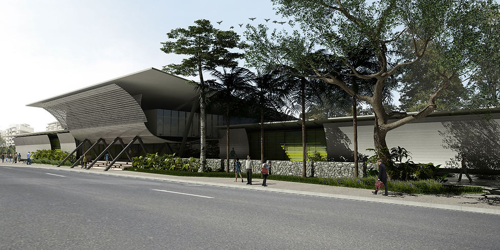 Ganhadores do concurso de ideias para mall em parceria público-privado, composto de áreas locáveis para lojas, auditório público, centro de apoio ao trabalhador e parque.