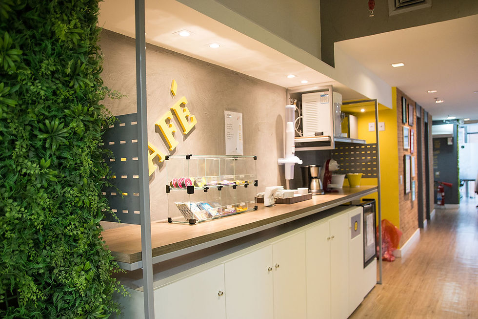 Projeto de layout e design de interiores corporativo para rede de coworking, incluindo desenvolvimento de identidade com paleta de cores jovem e mobiliário padrão para toda a rede