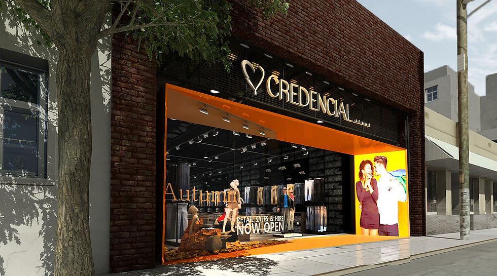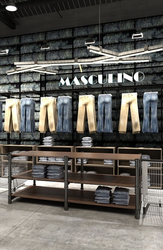 Projeto de arquitetura de varejo para loja atacadista no Bairro do Brás. Destaque para sistema de estoque nas paredes laterais com prateleiras piso ao teto em jeans e painéis decorativos na frente. Solução de fachada combina tijolinhos com pórtico na cor da marca, conferindo grande destaque e diferenciação frente aos concorrentes. Ambiente espaçoso e organizado, com iluminação adequada e áreas de exposição de produtos estrategicamente posicionadas.